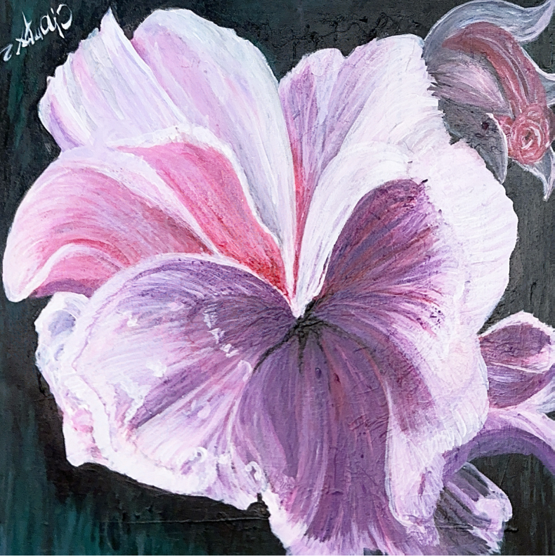 Abstract artpiece, with petals in focus, creating various patterns and designs and shades of purple